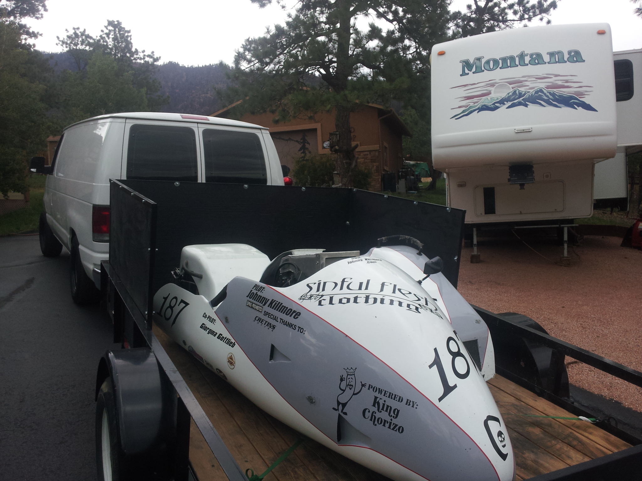 Or at least not when towing a race machine in an open trailer with a 1991 Dodge van. The ol’ gal has seen me through a lot, but it had major overheating issues that forced me to drive at night, and to cringe as we climbed hills at 45mph with the heater on, still running at the boiling point. We got the van to Montrose, Colorado where the kind people at Davis Service Center (www.davisservicecenter.com) let me rest the van in their fenced in work area. This is where I met Chris Rizzo, my co-driver for the Hill Climb. I had not seen Chris since the last time we were in Colorado more than a year ago. This year his newer van would be pulling us to the mountain and back, so I was doubly glad to see him. We spent the night at nearby Black Canyon of the Gunninson National Park. Great views and not very well travelled by tourists, so worth a look if you are passing through. The rest of the trip was uneventful and we made it to the Wagner’s place in Cascade, Colorado in short order.