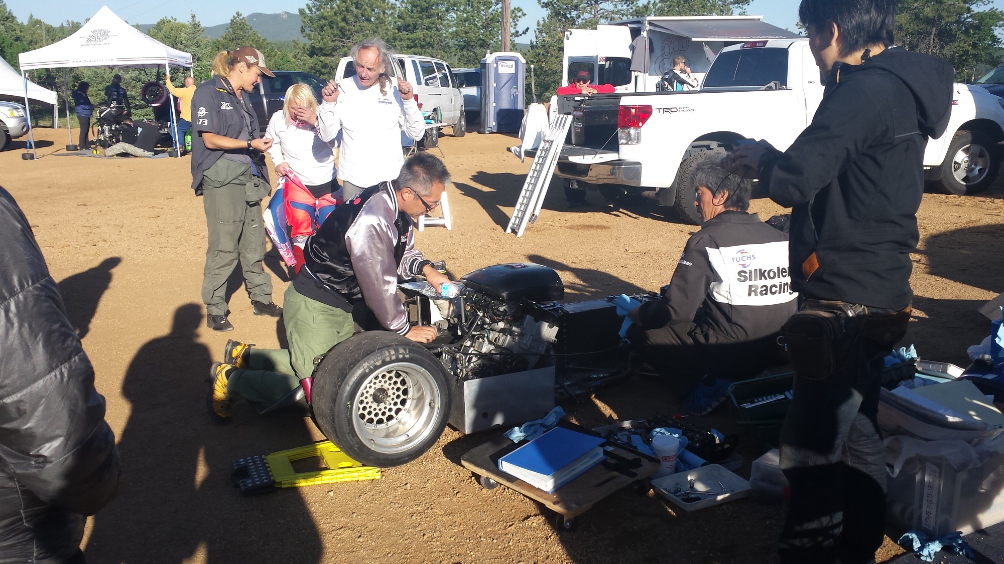 After four days of tremendous effort, Rising Sun Racing finally managed to fire their engine for the first time at the 2016 Pike Peak Hill Climb. The engine would run at the hotel, but every time they took it to altitude on America’s Mountain the lump would stubbornly refuse so so much as stutter. Finally, on the final day of practice, and after rebuilding the engine using parts from their spare, the machine came to life. Cheers around the entire paddock erupted because everyone had seen them pushing the machine and troubleshooting in a frustrating effort to get onto the race track.