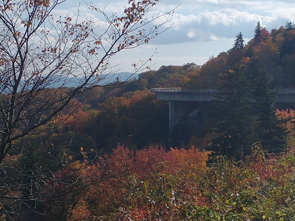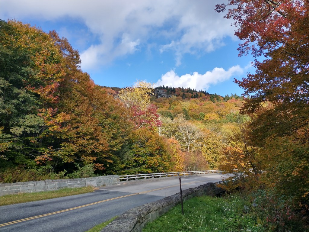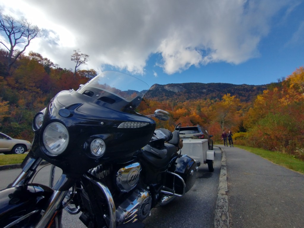 The BRP’s southern terminus is in Cherokee, NC, right by the reservation for the Eastern Cherokee people (not all Cherokee were marched on the Trail of Tears, so the Cherokee are spread out in more than one reservation). I grabbed a motel room at a wonderful little independent motel and even found a decent sushi restaurant for dinner. In the morning I was up and over Hwy 441, catching the fall colors as I rode through falling leaves and canyons of trees turning yellows, browns, and reds.