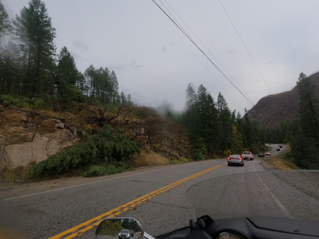 The first gusts were strong but brief, and for awhile I thought it might have been a fluke — a problem spot in a slot canyon. The rain started to spit soon after but the winds were predictable as I passed the Big White Ski Resort, then things cleared up.