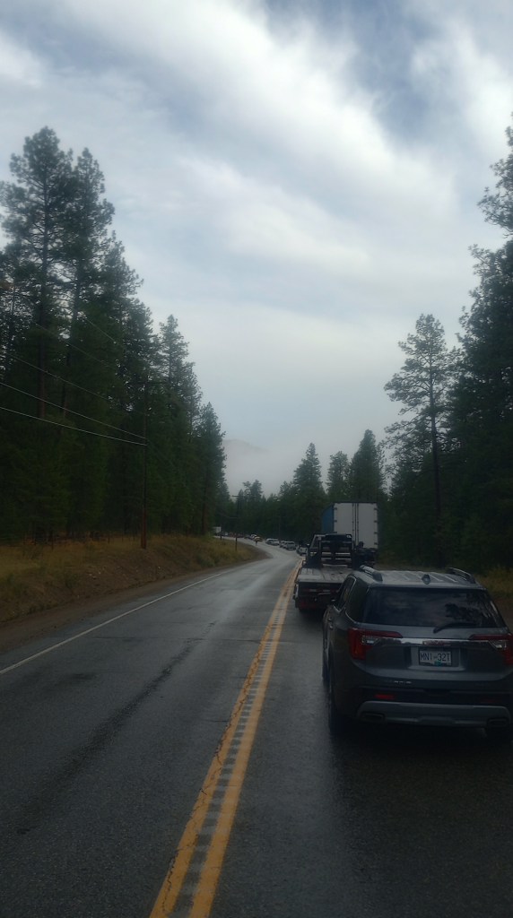 I chatted with locals who were milling outside their cars. Plenty of people knew each other so it was like an impromptu picnic, without food, or a place to sit, on a road. So, not like a picnic. Anyway, I got more information from others who had family down in Rock Creek. Apparently there were fires south of there, on the US and Canada side of the border.