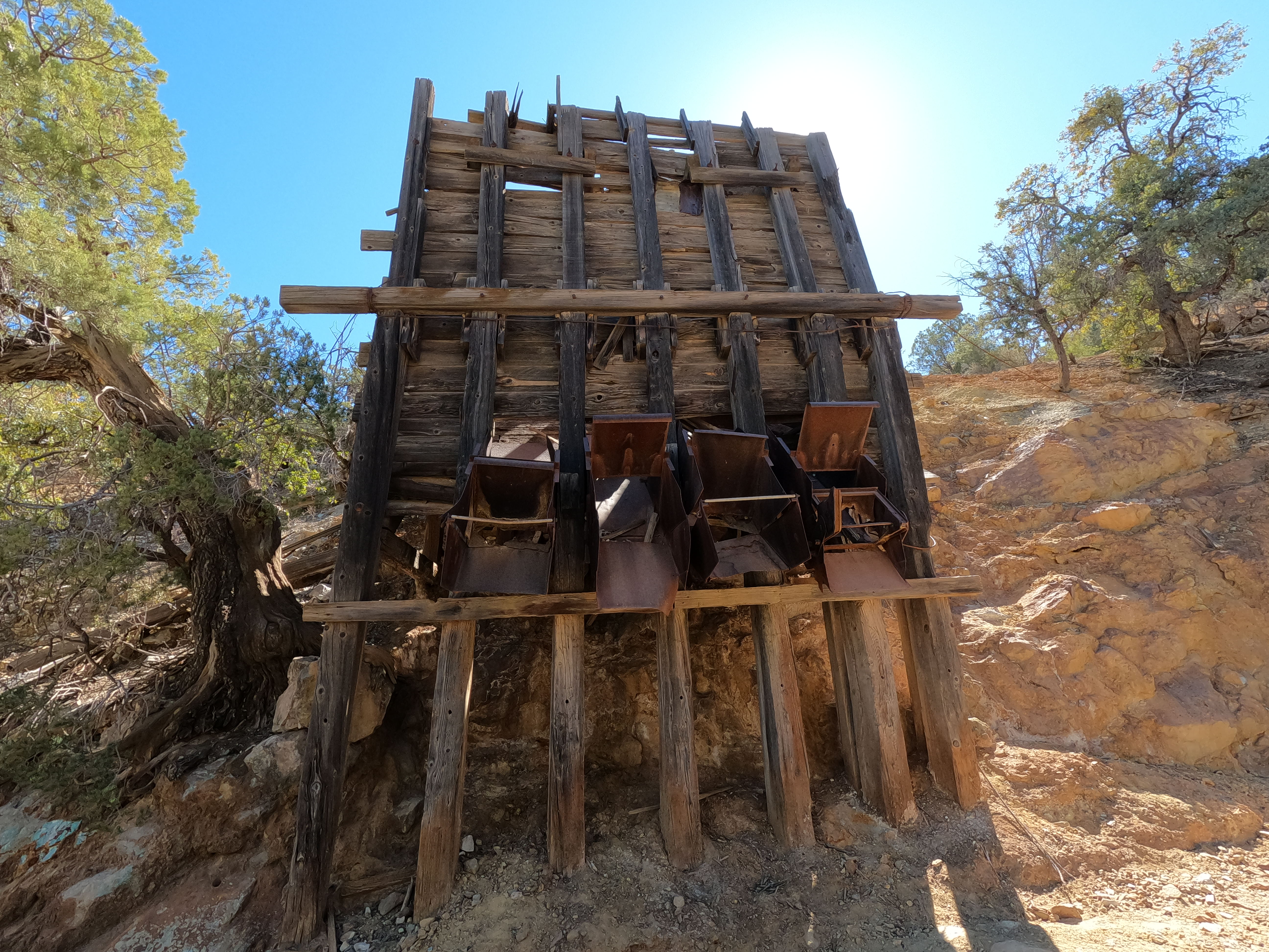About a half-mile up was a flat space with some concrete slabs that may have once held a tower for cable ore carts. There was no evidence left though and steel cabled that long and heavy are almost always abandoned in place. I was more focused with huffing and puffing my way up the trail and doing my best to stay out of ruts and rills.