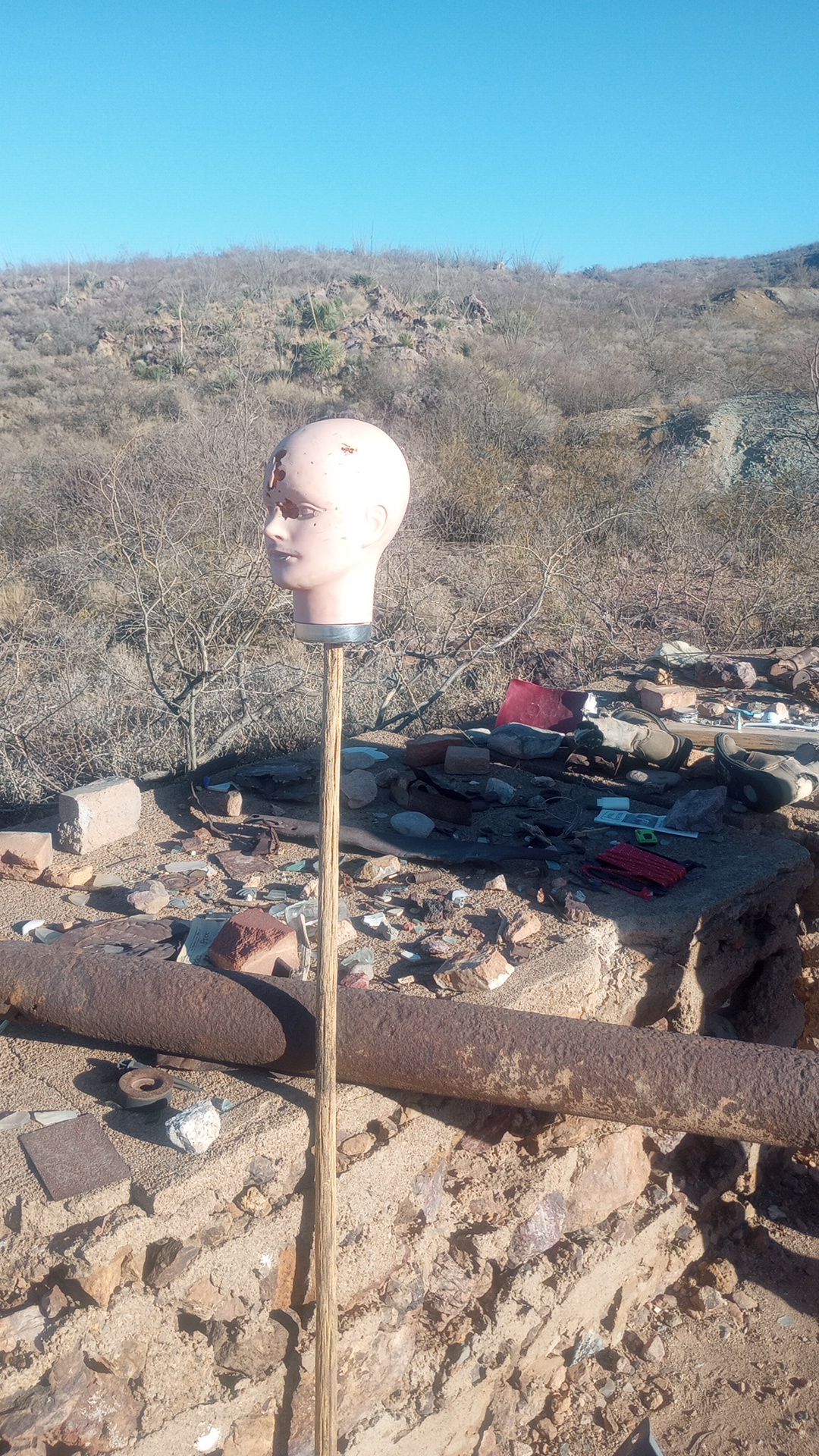 Near Courtland are a few other ruins, one of which is “The Pack Rat Table,” which is just an abandoned concrete slab that people keep piling junk on. It’s been going on long enough that someone actually made a sign for it. It’s mostly a few unique rocks, old cans, a mannequin head, and other desert detritus.