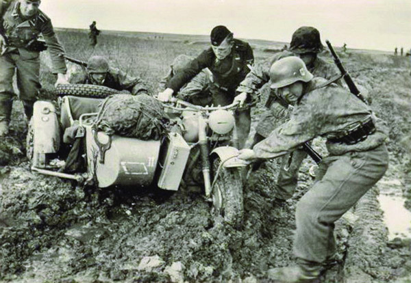 Several Germans soldiers attempt to free a BMW motorcycle sidecar from deep mud in an open fieldIf they were made for war, motorcycles would serve a more prominent place today. However, it’s wrong to think motorcycles were completely abandoned by modern militaries.