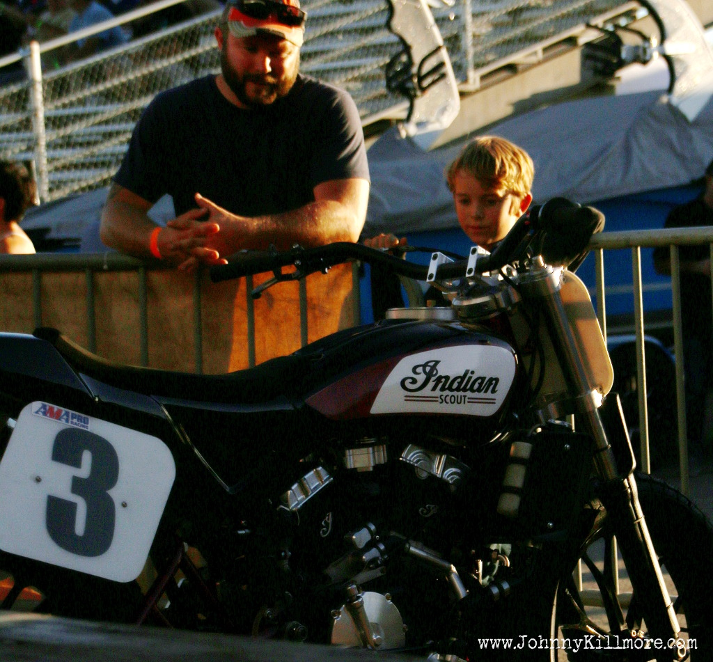 flat track racing motorcycle FTR 750 foreground with father and son in background flat track racing motorcycle FTR 750 foreground with father and son in background